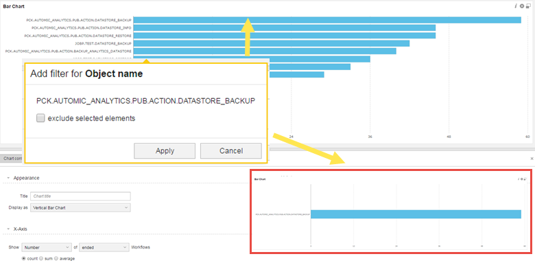 The following chart shows the number of ended Workflows by object name. You can click one of the Workflow names to access additional information: