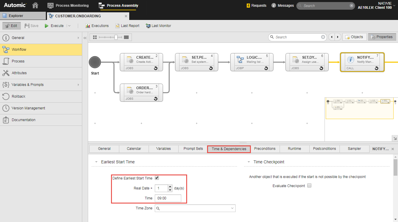 A Workflow with many tasks usually runs for a long time. It starts everyday at 16:00. The last task in the Workflow must be executed always on the next day at 9:00. You define this time condition on the task Time & Dependencies properties tab specifying the Real Date for the task start as follows: