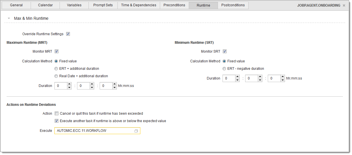 If you define a maximum or minimum runtime, you must also define the action to be executed in case the runtime exceeds the maximum or falls below the minimum.