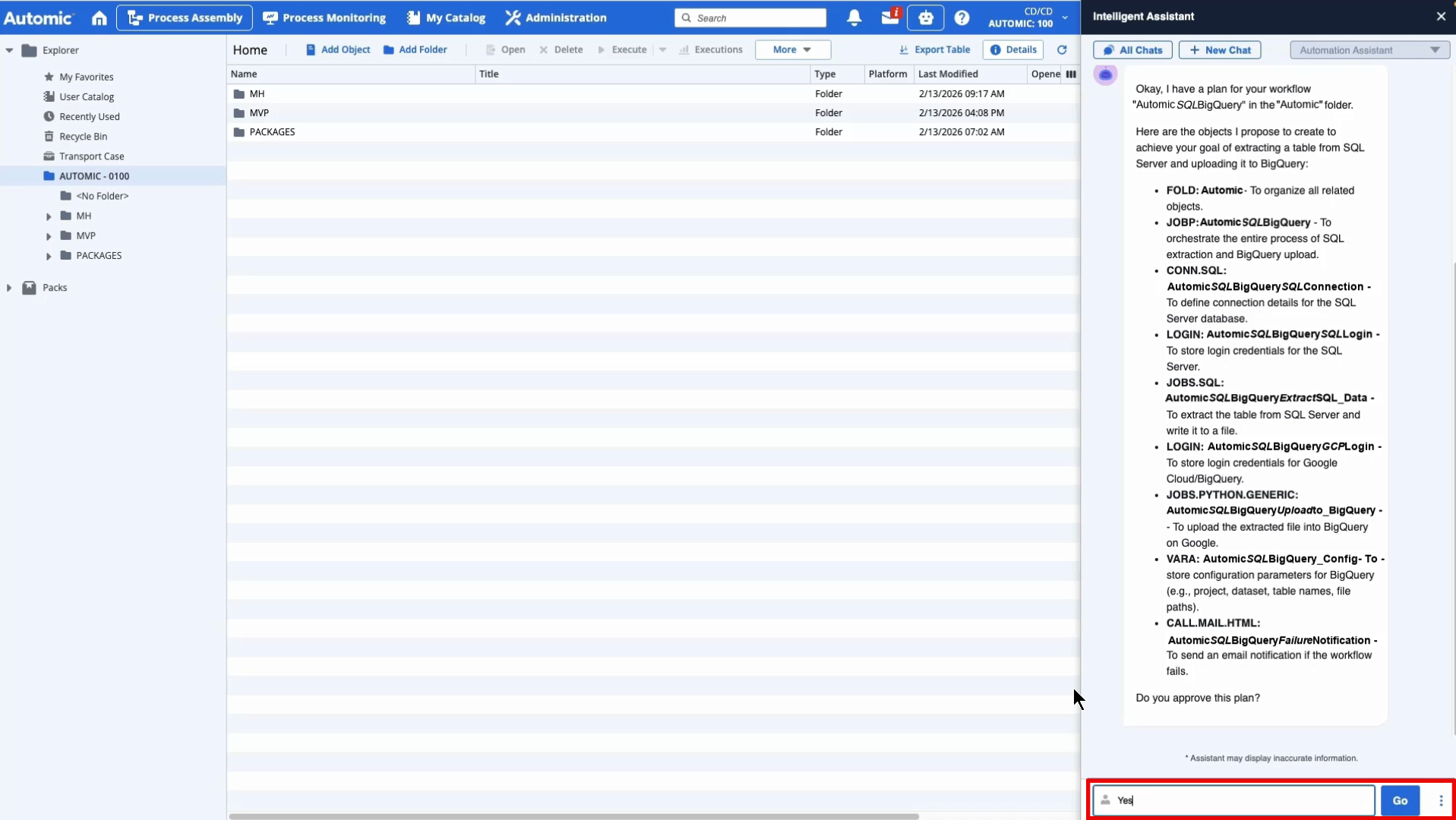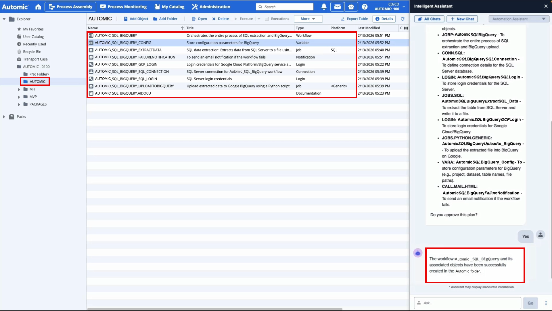 Once you have approved the suggested plan, the Automation Assistant will create all objects in the specified folder. A confirmation message will appear: