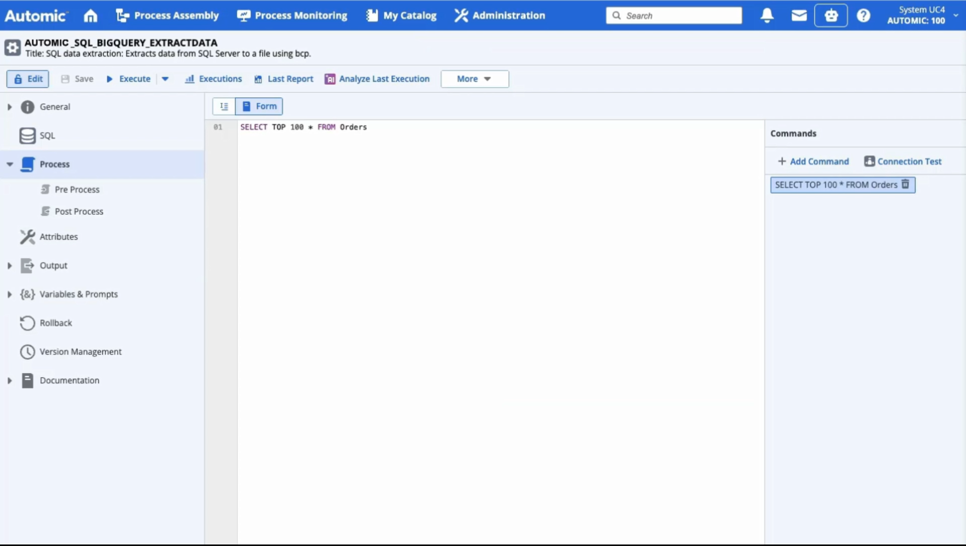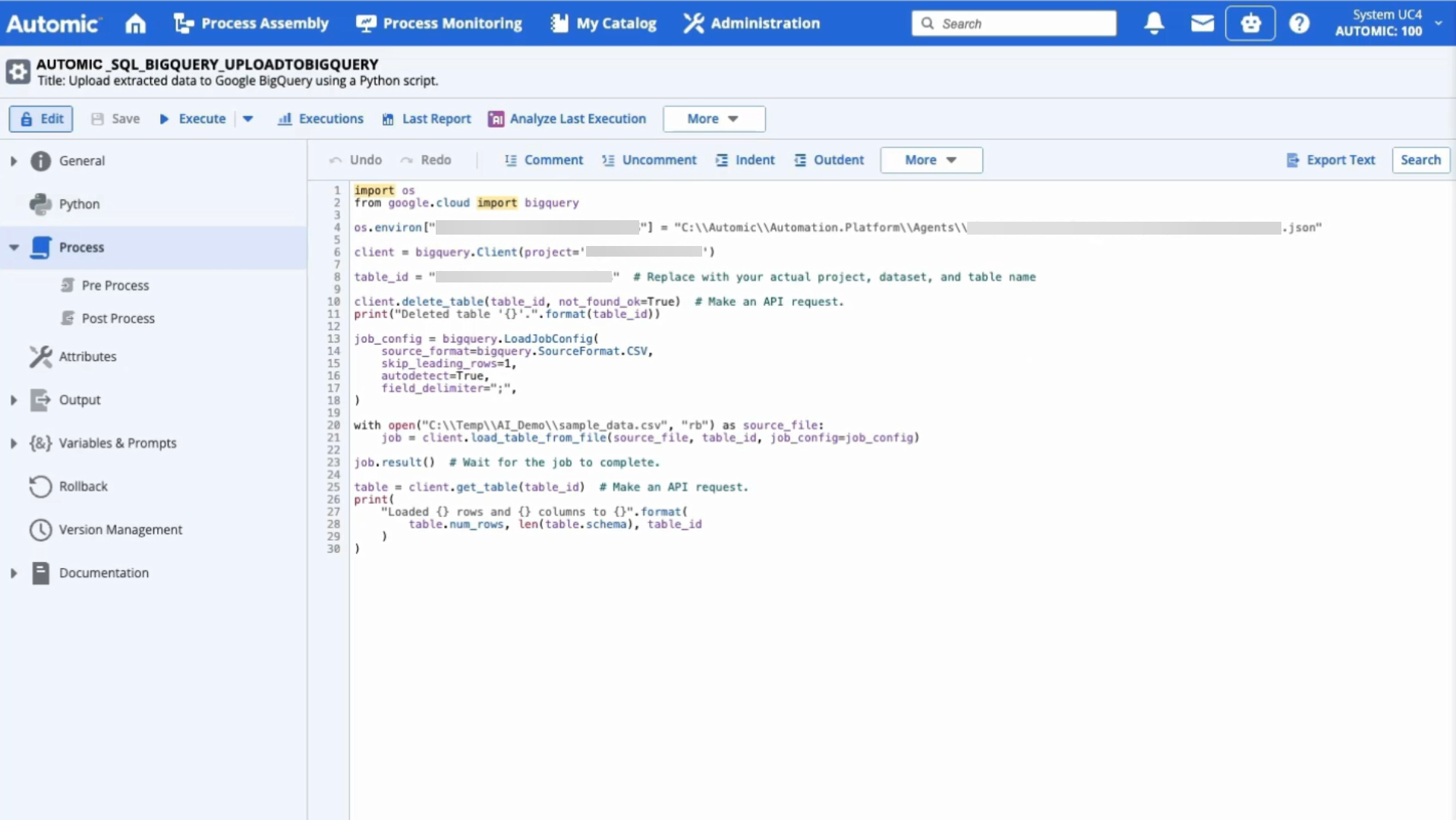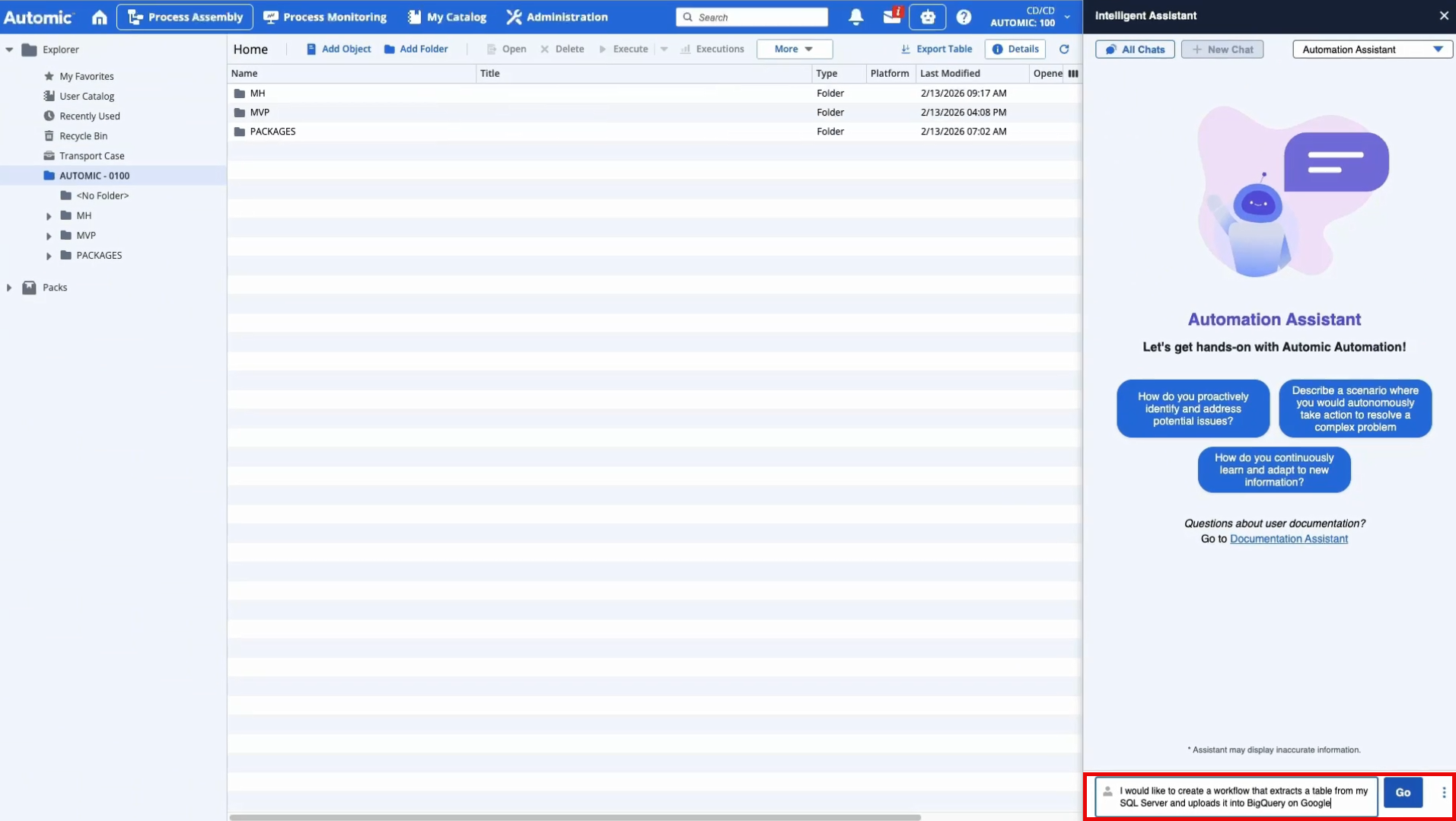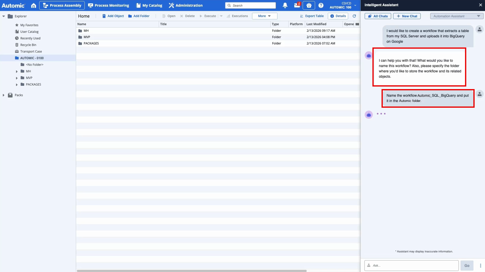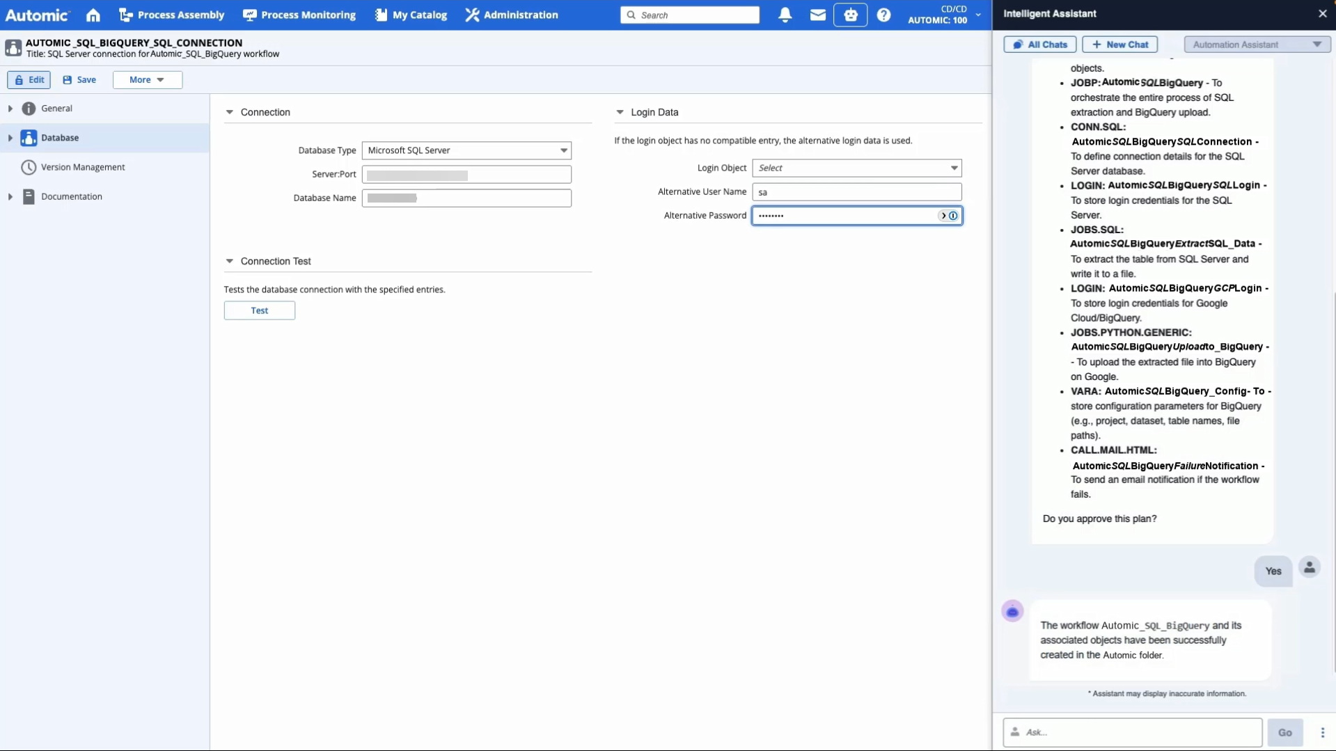 This use case demonstrates how to use the Automation Assistant to create an end-to-end data pipeline. With a few conversational prompts, the Automation Assistant creates a Workflow that extracts a data table from an on-premise SQL Server and uploads it to BigQuery . The Automation Assistant automatically generates a folder structure, Connection objects, VARA objects, SQL Jobs and Python Jobs. The configuration also takes care of error handling and email notifications.