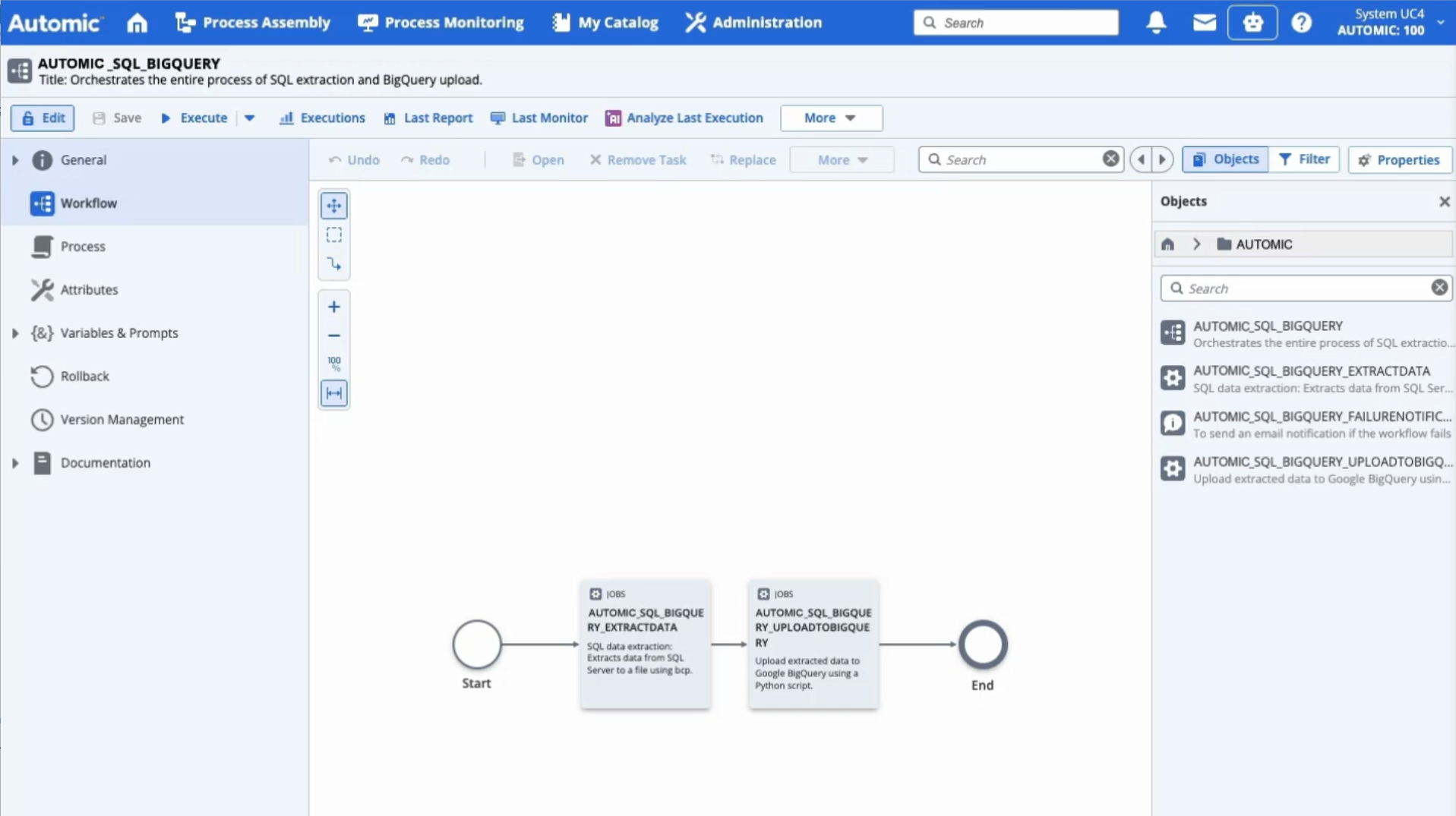 The Workflow Automic_SQL_BigQuery and its associated objects have been successfully created.