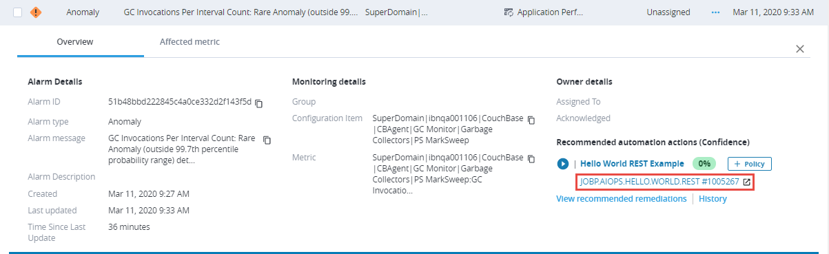 There are no recommended actions yet. We will execute the first action on this alarm using JOBP.AIOPS.HELLO.WORLD.REST.