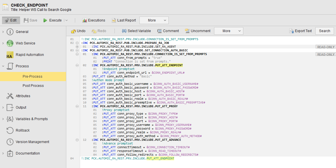 Open the Process > Pre-Process page, which contains the script that performs the search. The script is comprised of various Include objects: