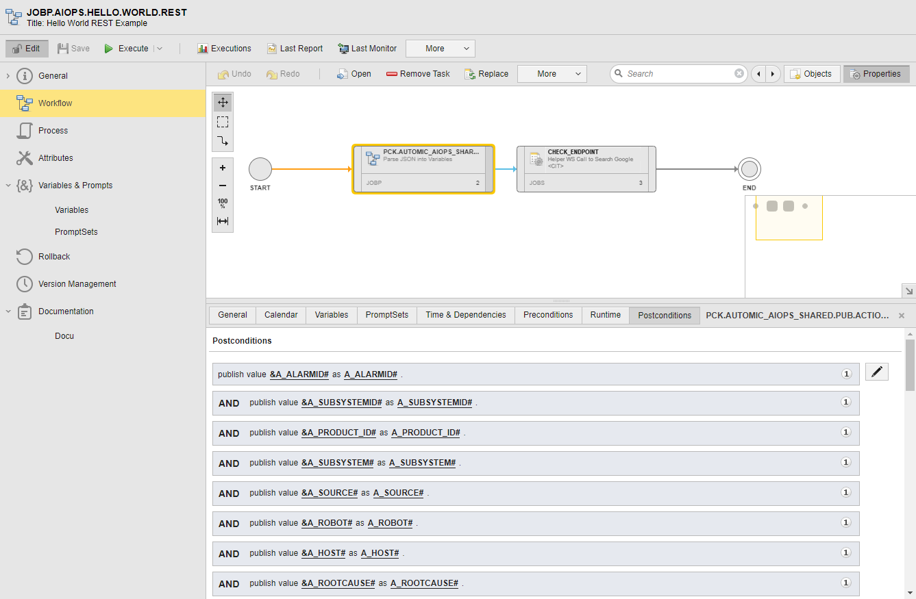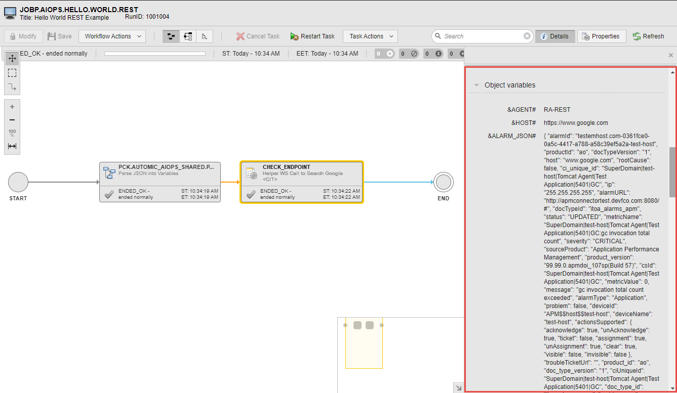 JOBP.AIOPS.HELLO.WORLD.REST picks the text provided in the message of an alarm and makes a Google search using this text. The result of the search is displayed in the Workflow The Workflow consists of two tasks: