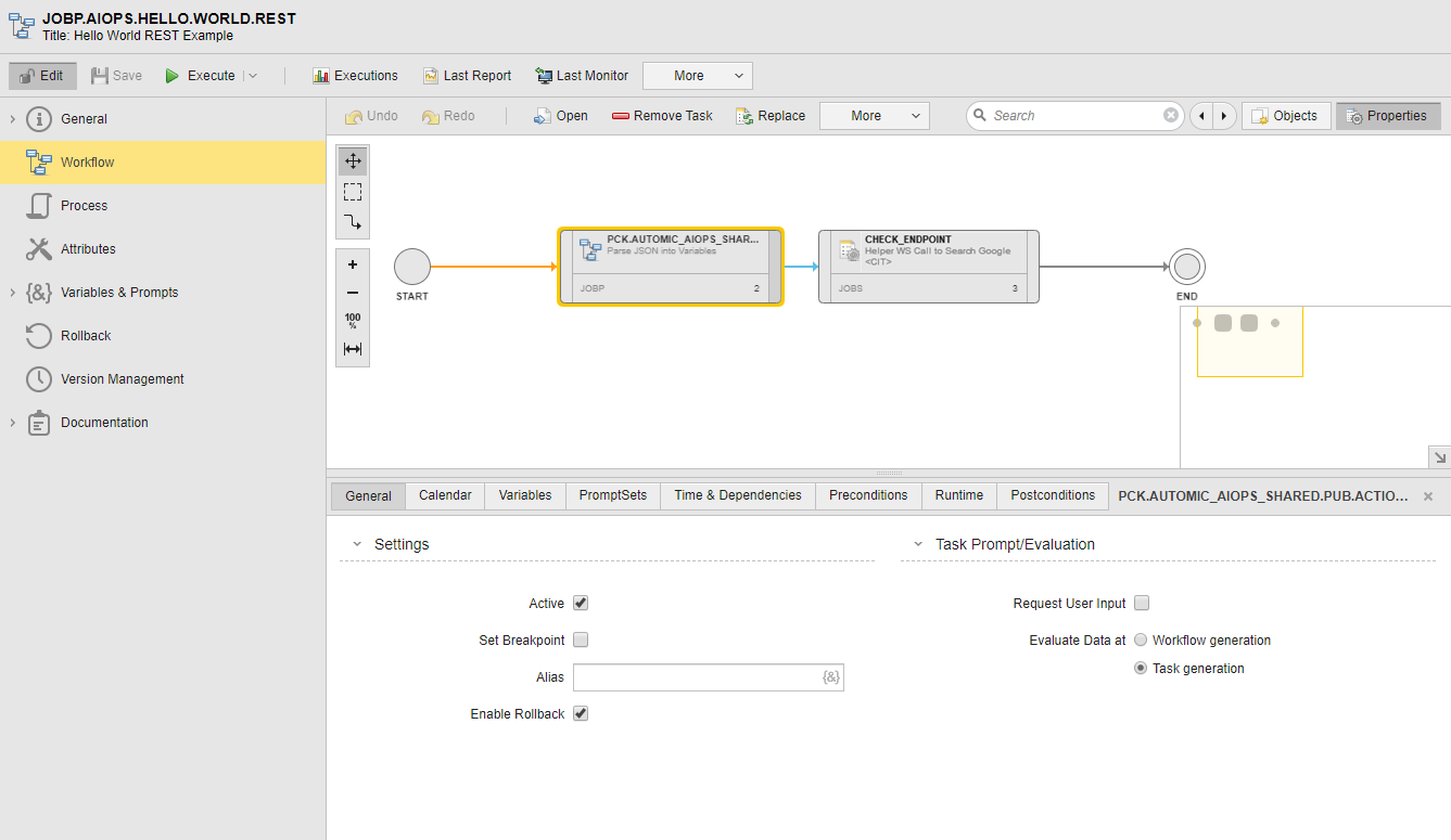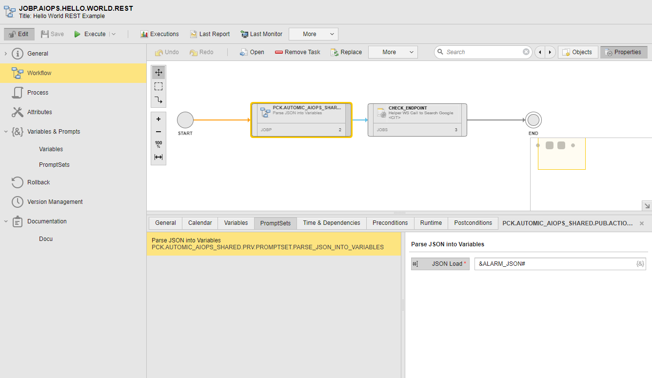 The AIOPS template is pre-configured. It creates a Workflow that already contains the first task, which is itself a Workflow called PCK.AUTOMIC_AIOPS_SHARED.PUB.ACTION.PARSE_JSON_INTO_VARIABLES.