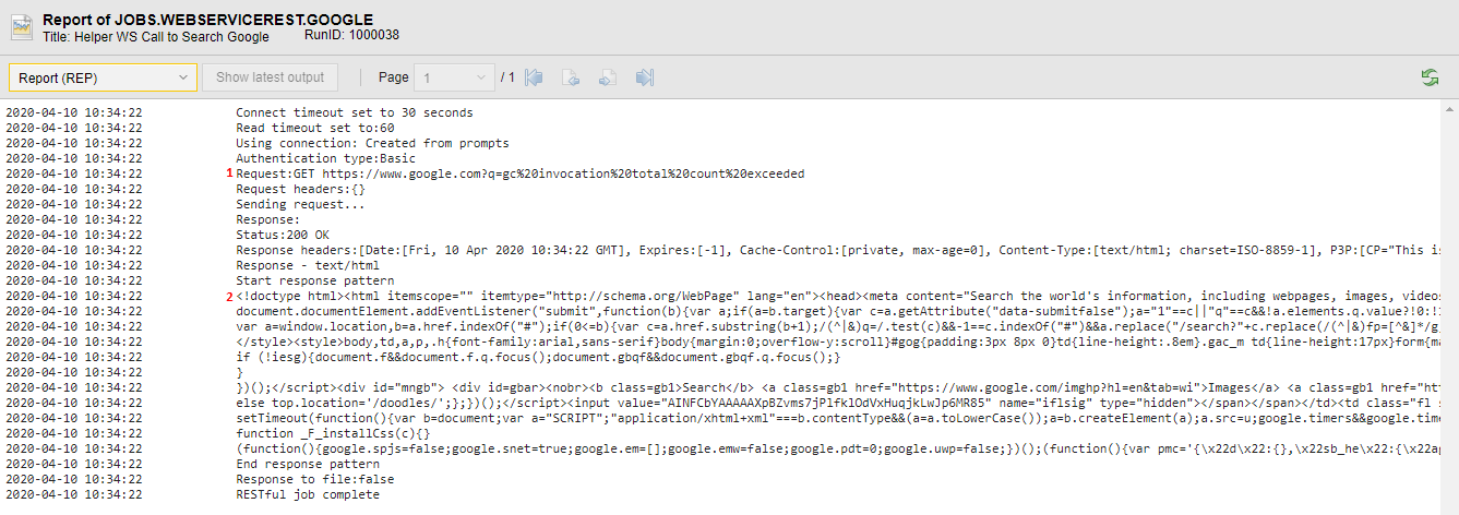Automic Automation for AIOps provides extensive reports that track every step of the execution. To see the outcome of the google search that the CHECK_ENDPOINT Job carried out, open its report: