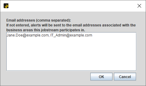 When email is sent for an alert, it is sent to any email address associated to the Business Area(s) of the jobstream. If you want alerts sent to a different address or addresses, click the button labeled email addresses... at the top right of the Alert Criteria tab. The addresses entered into the resulting dialog (see the figure below) will override any addresses coming from the Business Area. For more information, see Add/Edit Business Area - General Tab.