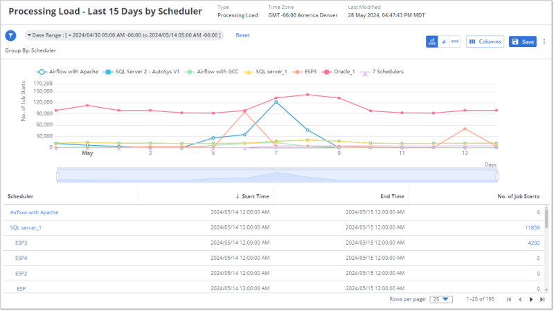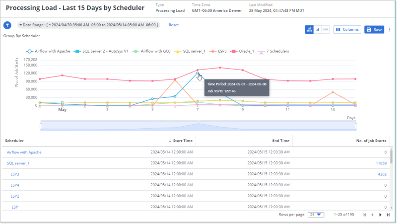 When the window opens the table is already filtered for the time period that you were viewing on the Processing Load data insight when you opened the window, and for the scheduler that the jobs started on.