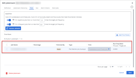 No matter whether the system calculated AutoTrim function is enabled or not, you can always define trim points manually. The trim point is the job that you designate as the one as of which all the upstream dependencies will be removed from the jobstream. When defining manual trim points, you can decide what AAI will remove: