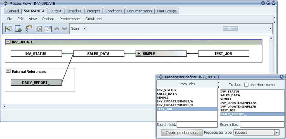 If you are working with a large process flow, or you want to add more than one predecessor link at a time, you can use the Predecessor Definer window. In the image below, the TEST_JOB component is selected in the From Jobs box, and DAILY_REPORT is selected as the To Job box. When you click Create predecessors, Applications Manager will draw predecessor links from the TEST_JOB component to the DAILY_REPORT component.