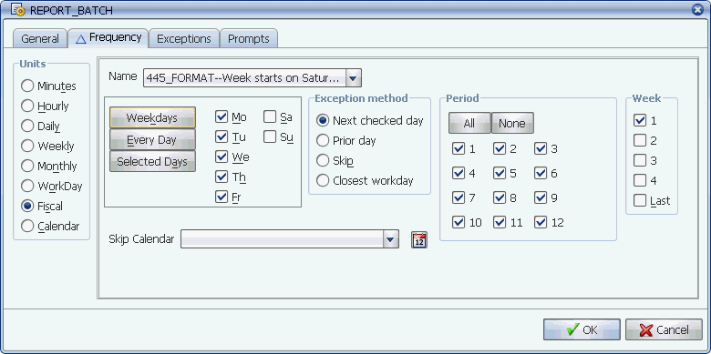 When you select Fiscal in the Units group box on the Frequency tab, Applications Manager displays the fields shown in the image above. The fields are described below.