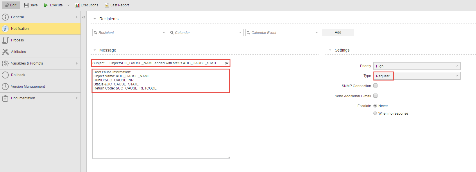 2. The Subject and body of the text in the Message section are predefined if you select a template other than STANDARD to create the notification. However, you can change them.