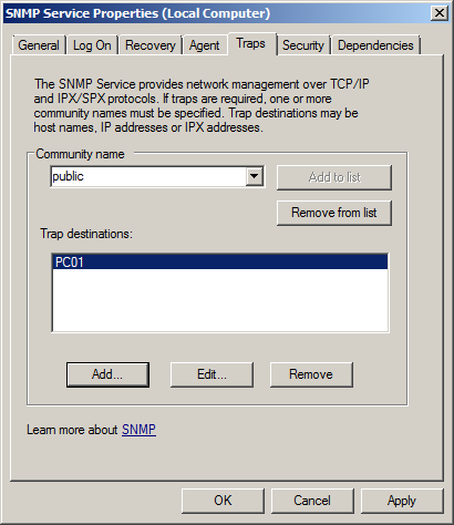 Switch to the Traps tab. Enter a community name and specify the computer on which the SNMP Management has been installed.