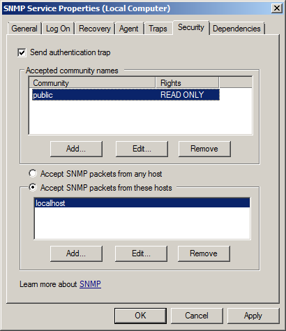 - Open the properties of the Windows SNMP Service.