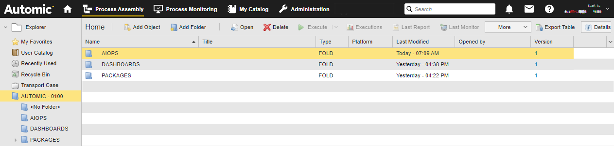 The AIOPS folder is always available; it is the connection point between Automic Automation for AIOps and DX Operational Intelligence.