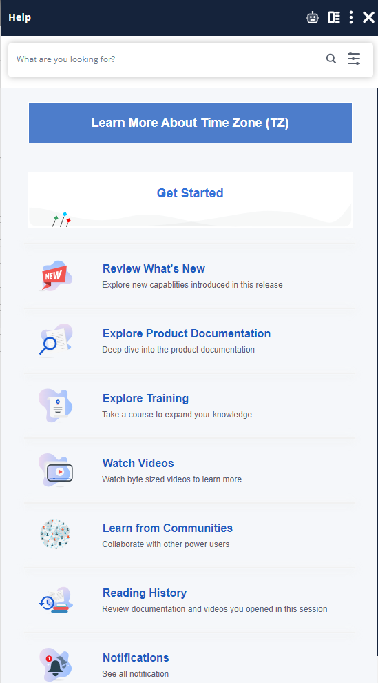 The Automic Automation Help is much more than just a context-sensitive help. It is an intuitive panel that curates context-sensitive information from YouTube, the product documentation, the Automic Automation Community, the Support Knowledge Base, and the Broadcom Software Academy. Its home pane allows you to get started with Automic Automation and Automic SaaS by reviewing documentation, videos and education courses.