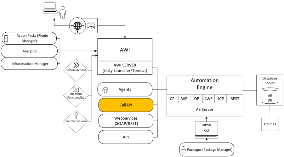 As an administrator, you install the CallAPIs to trigger processes in an AE system from external systems by using the Automation Engine scripting language. You can use them either with your own program, or with a utility. A CallAPI is limited to 32000 characters, as are all scripts in the Automation Engine scripting language.