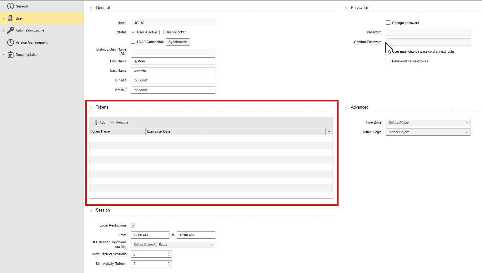 With this version, users with the necessary privileges can generate and manage their own tokens. In AWI, a new section is now available in the User object definition that lets you generate and manage user tokens: