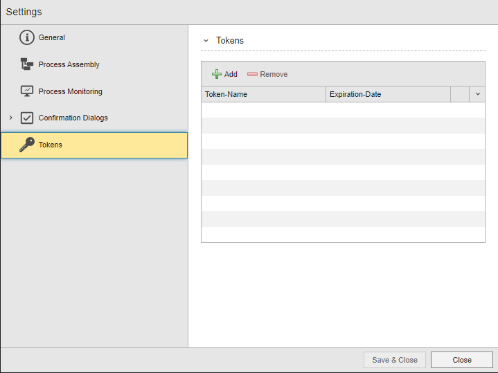 Users who do not have access rights to their User object definitions can generate and manage their tokens in a new tab called Tokens on the User Settings dialog: