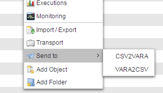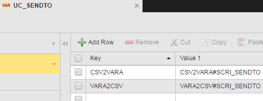 Two keys have been defined, CSV2VARA and VARA2CSV. They result in two additional sub menu options that call the CSV2VARA#SCRI_SENDTO and VARA2CSV#SCRI_SENDTO objects respectively: