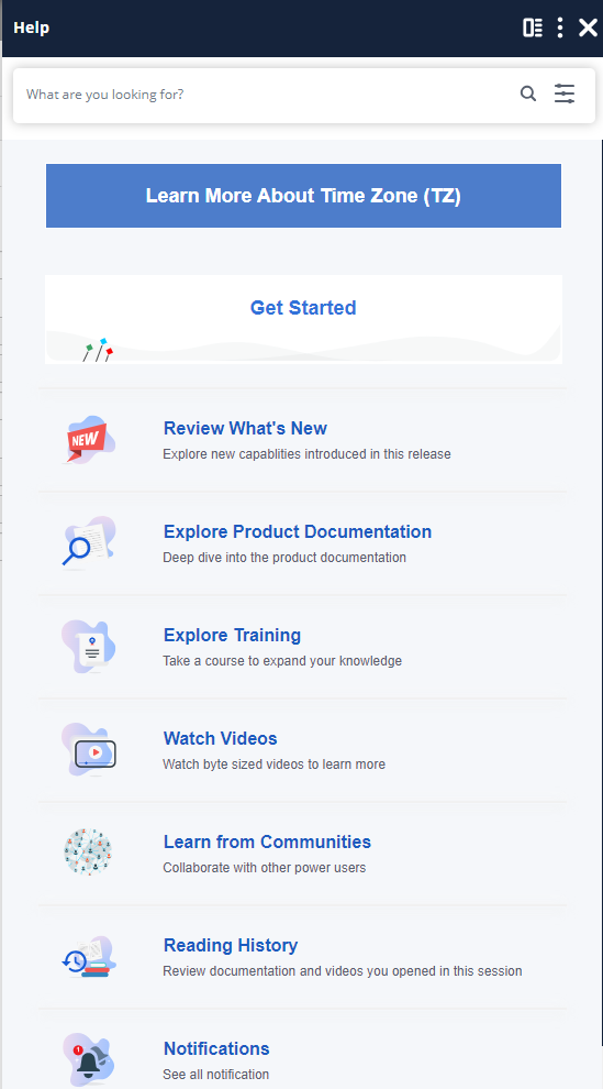 When you click the Help (?) button, you open the main panel (see previous screenshot). It consists of a menu bar, a search area, the breadcrumbs and the content area.