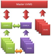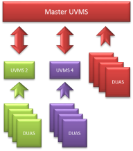 The subordinate UVMS and its Dollar Universe node clusters are isolated from other UVMS/DUAS nodes. The subordinate UVMS (2 or 4) do not see the Dollar Universe V6 nodes of the master UVMS nor those of the other subordinate UVMS. It only shows its own nodes to the master UVMS.