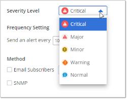 Each severity level has an icon and a color that act as an identifying badge that appears with a system alert appears on the screen. The severity level helps you identify how urgently you need to respond to the situation the alert indicates, and to help you organize the triggered alerts by severity when you view them on the System Alerts page.