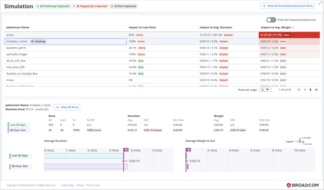 On the Simulation details page, you see a list of the jobstreams that the job affects and the kind of impact the simulated changes would have on those jobstreams and you can select jobstreams to see the specific predicted affect on the jobstream