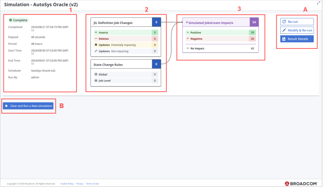 Simulated Jobstream Impacts: A box with the total number of jobstream runs that are projected to be affected by the changes proposed for the simulation, both positively and negatively. Below the header, this box provides the breakdown of number of jobstream runs based on the kind of impact the simulations would have on them.