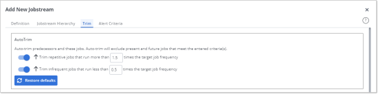 If the AutoTrimming function is enabled on the server, the AutoTrim section on the Add/Edit Jobstream dialogs (Trim tab) is also enabled. It displays the values defined on the server to trim jobs based on their frequency/repetitiveness. As a jobstream administrator, you can override the default auto-trimming parameters for this particular jobstream here: