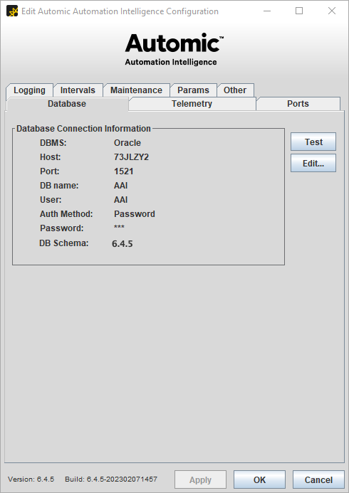 To change the database connection information, click the Edit button. Once the information has been modified click the Test Connection button to verify.