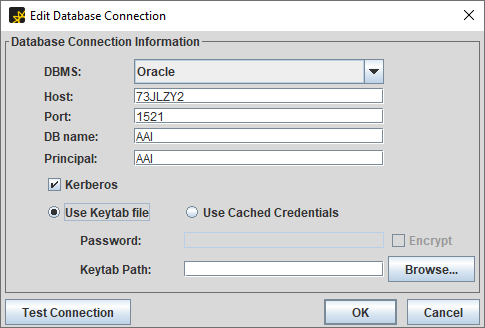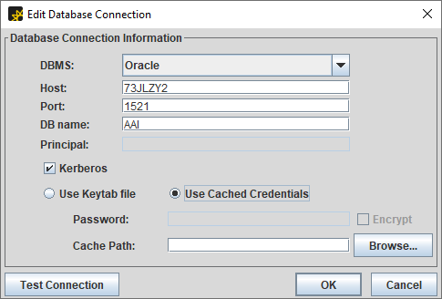 When you use an Oracle database, you can also use Kerberos authentication using either a keytab file or cache credentials.