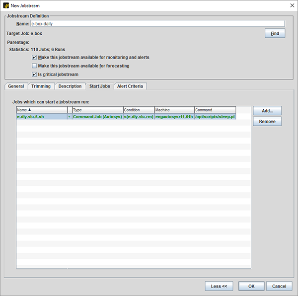 Trimming a jobstream and setting the start job are two different functions. When you trim a jobstream, you eliminate jobs from the jobstream and, therefore, you actually tell AAI not to collect part of the jobstream data. AAI's analysis, calculations and so forth ignored the excluded jobs because they are no longer part of the jobstream. However, when you define custom start jobs, AAI does collect all the data from all the jobs that are part of the jobstream, also of those that run before the new start jobs.