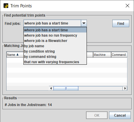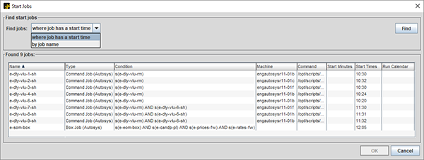 Use the Find Jobs dropdown list to filter the list of candidate jobs by their start times and names. Define the filter and click Find to get the resulting list of jobs. It provides the following information: