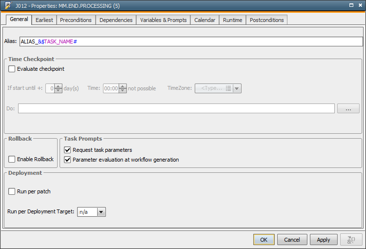 You can use the General tab in order to assign an alias name and to set time checkpoints for workflow tasks. If a task has not started until the specified time, the object that is defined in the Do section will be activated.