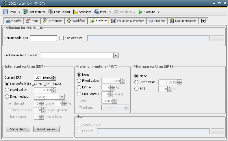 The maximum runtime is monitored. The valid estimated runtime (ERT) at the time of the task's activation is used as the maximum runtime. An action ( ELSE condition) must be specified which reacts when maximum runtime is exceeded. |