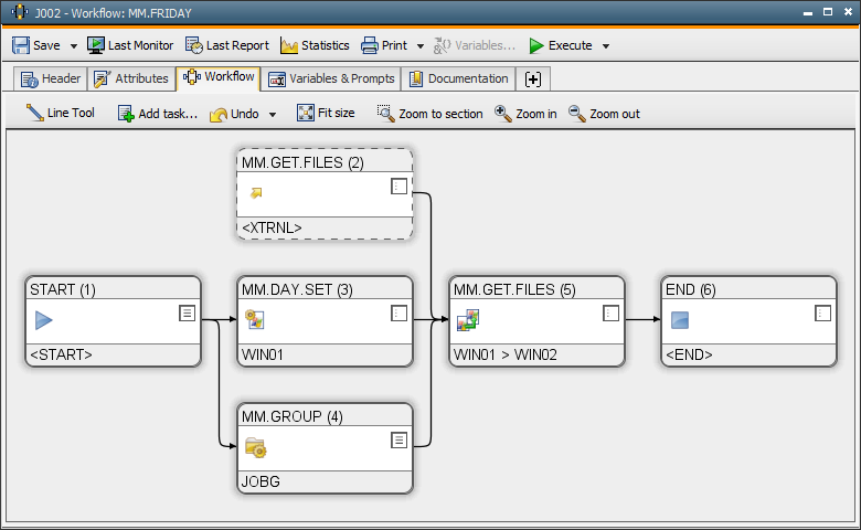 An external dependency is graphically displayed in the form of a dashed box. The following illustration shows an external dependency to the file transfer "MM.GET.FILES". Therefore, the job "MM.END.PROCESSING" will only start if the file transfer has ended with the defined end status.
