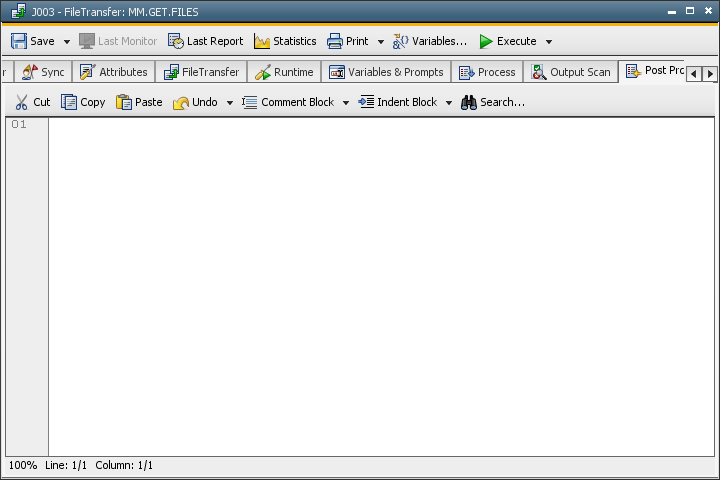 Post-Process Tab The Post Process tab is an object type-specific tab that is only available in the objects "FileTransfer", "Job" and "RemoteTaskManager". Processing commands can be stored here in AE's script language.
