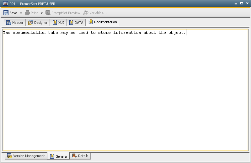 All Documentation tabs that the administrator has defined in the variable UC_OBJECT_DOCU are shown. Note that imported objects have their own Documentation tabs.