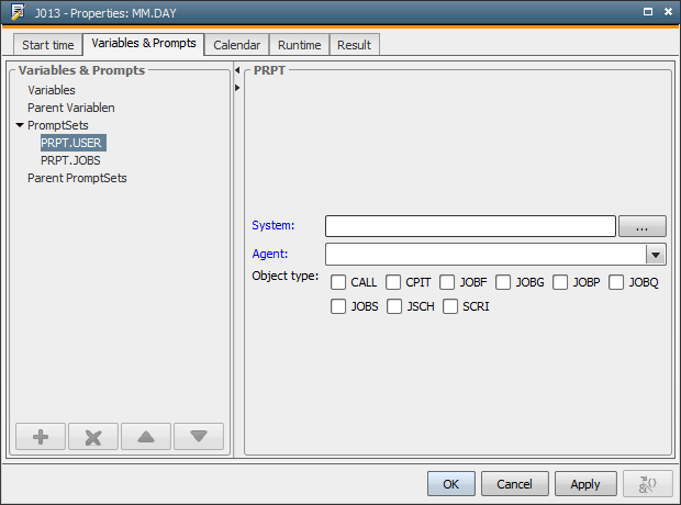 The Variables & Prompts tab can be used to change the values of object and PromptSet variables of Schedule tasks. In doing so, you can activate Schedule tasks with particular values.