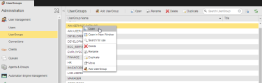 The UserGroups page of the Administration Perspective lists all user groups of a client and allows you to group users in as many groups as desired to assign them identical authorizations and privileges, thus, helping to simplify administrative tasks. Right-clicking a user group opens a context-menu which provides all functions available such as adding, deleting, renaming user groups, etc.