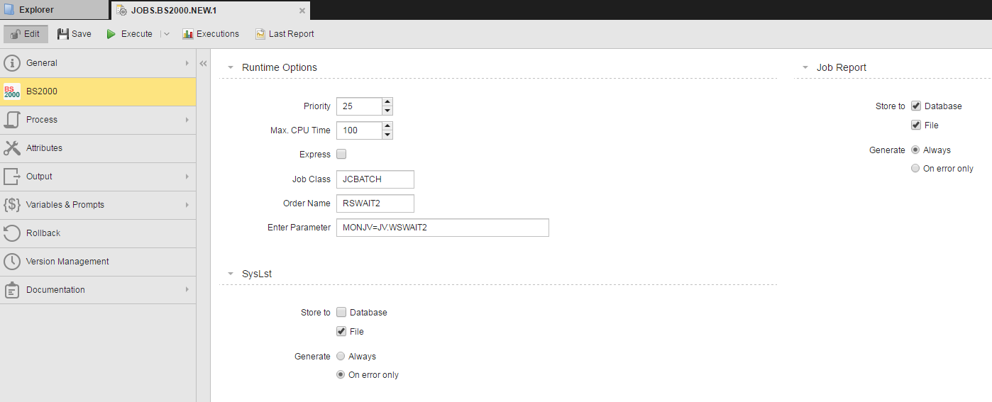 This subtype of the JOBS object is used to run scripts on BS2000 platforms and to define how runtime options, reports and protocols must be processed. Like all other job objects (JOBS), BS2000 jobs can run independently or they can be added to a group (JOBG) or to a workflow. For details on the integration between the Automation Engine and BS2000 please refer to Java EE/JMX Agent.