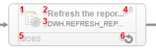 The marked areas in the illustration below are some of the main elements that you will use when working with the Workflow editor. Click on them to open a description of their functions: