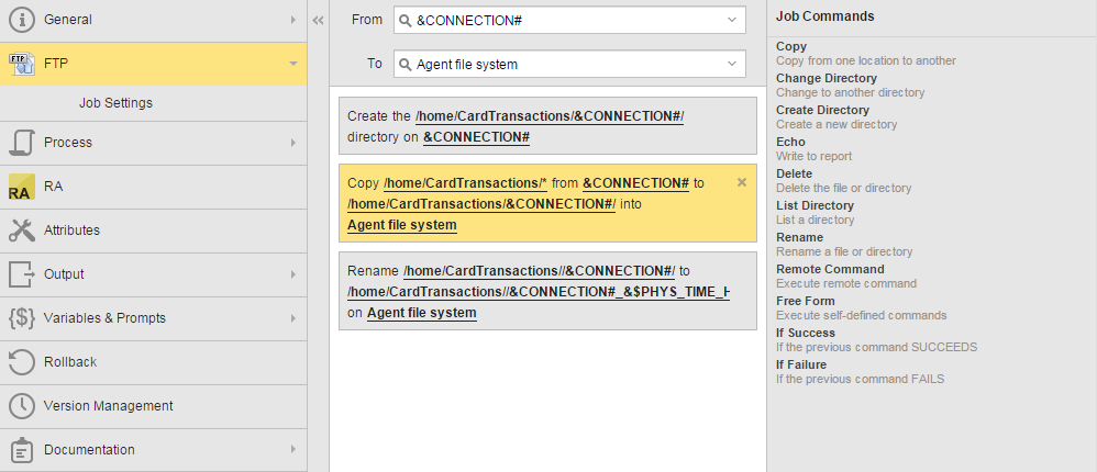 An FTP Agent Job named JOBS.FTPAGENT.GET_CARD_TRANSACTIONS_SELECT_REMOTE_HOST is shown below. The variable &CONNECTION# is entered as the From host. This means that when the Job is executed, the value for the From host will be determined by the value of the &CONNECTION# variable.