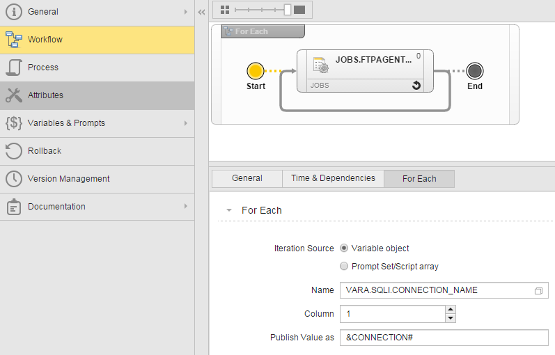 If the job is executed within a ForEach Workflow, the value of the variable is set by the ForEach Workflow properties, where a VARA object is assigned as the source for the variable's value. When the Workflow runs, it spawns an instance of the FTP Job for every host returned by the VARA object.