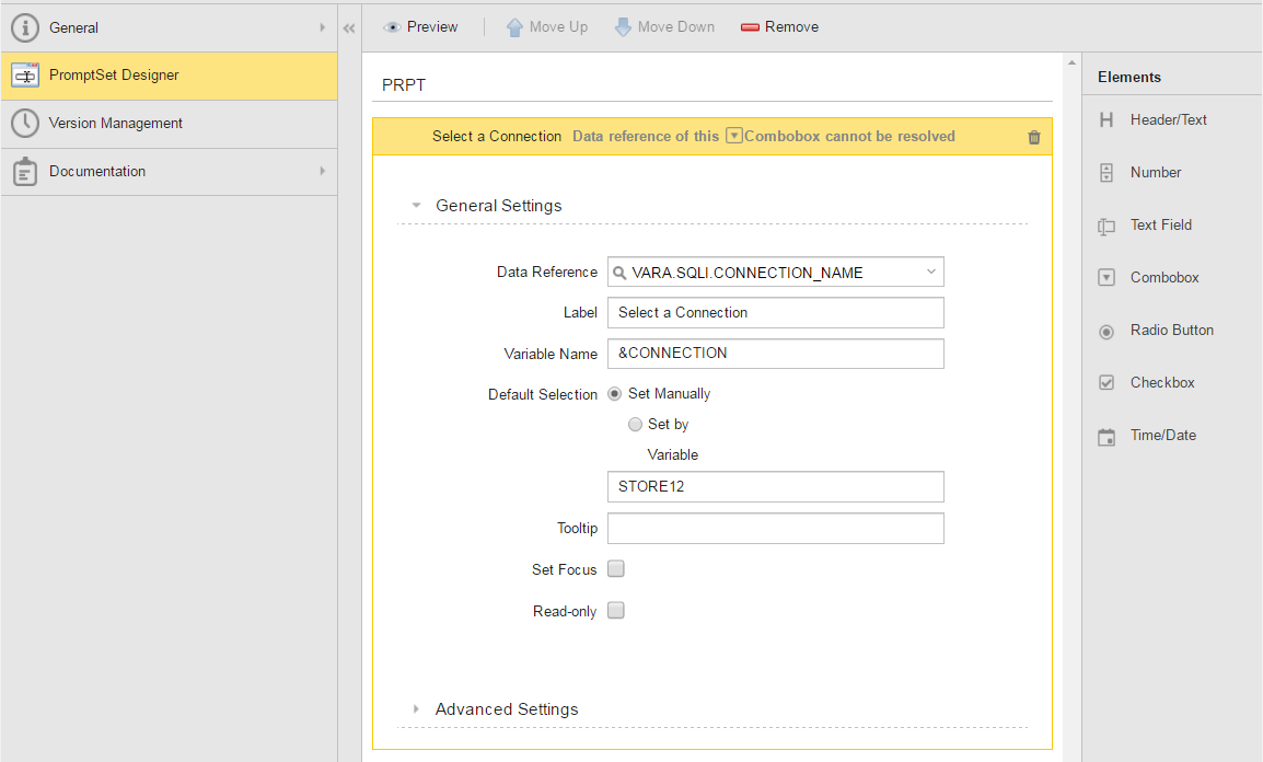 The PromptSet definition for PRPT.CONNECTION is shown below. Notice that the VARA object VARA.SQLI.CONNECTION_NAME is the data reference for PRPT.CONNECTION's only prompt.
