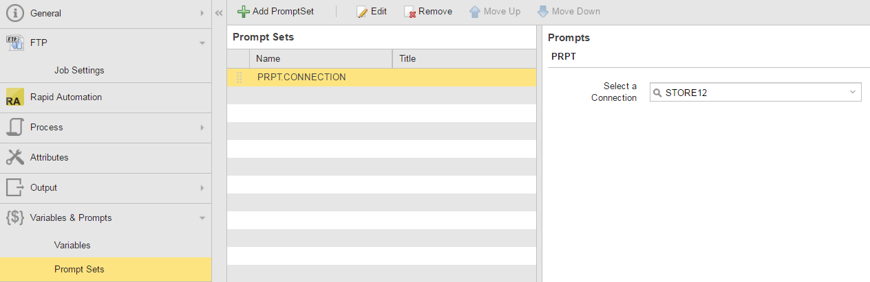 The &CONNECTION# variable is set each time the JOBS.FTPAGENT.GET_CARD_TRANSACTIONS_SELECT_REMOTE_HOST Job is executed by a prompt defined in a PromptSet object named PRPT.CONNECTION, which is assigned to the Job as shown below: