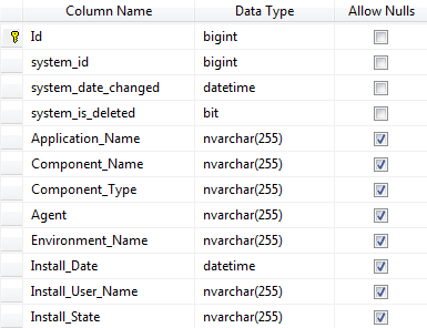 | Id | system_id | system_date_changed | system_is_deleted | Applicaction_Name | Component_Name | Component_Type | Agent | Environment_Name | Install_Date | Install_User_Name | Install_State |