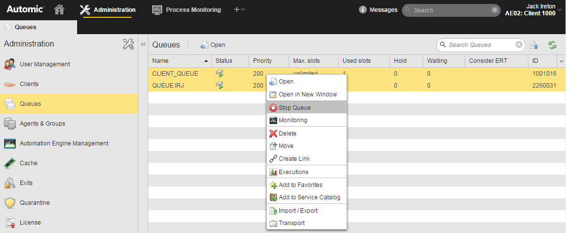 - Select multiple queues and right-click to stop or start all multiple queues or right-click to stop or start a single queue. From the right-click option, select Stop Queue/Start Queue to change queue status(es).